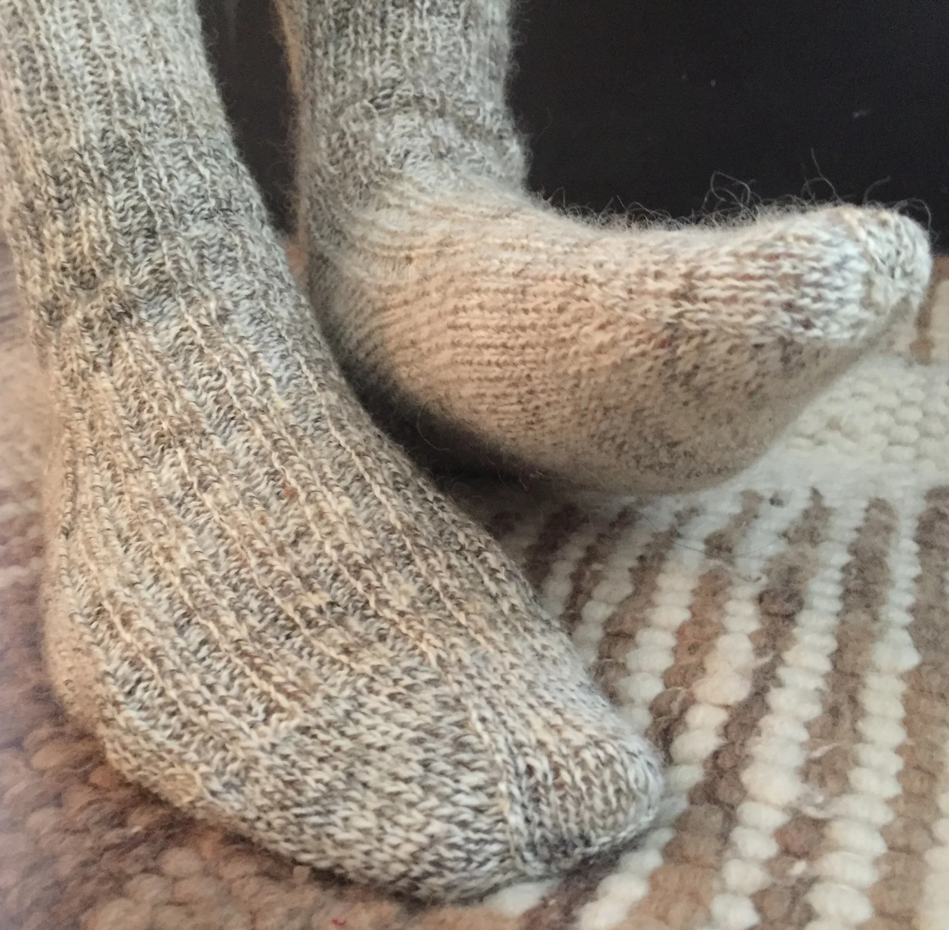 I finished the first pair! To recap, the yarn is a three ply hand spun ‘illegal’ (mix of Z and S spun yarns, plied S) yarn that my mum and I made from fiber bought at the Maryland Sheep and Wool festival. I actually knitted a swatch! The gauge I got was 8 stitches per inch (Mommy got 9), as it’s a bit heavier of a sock yarn. In order to have the yarn tightly plied enough, we had to overplay this yarn, so it is far from balanced and really likes twisting up on itself. Because of that my swatch is less of a rectangle… the yarn is also fairly scratchy, and my pointer finger on my left hand, where I hold and tension the yarn, didn’t really like this yarn.